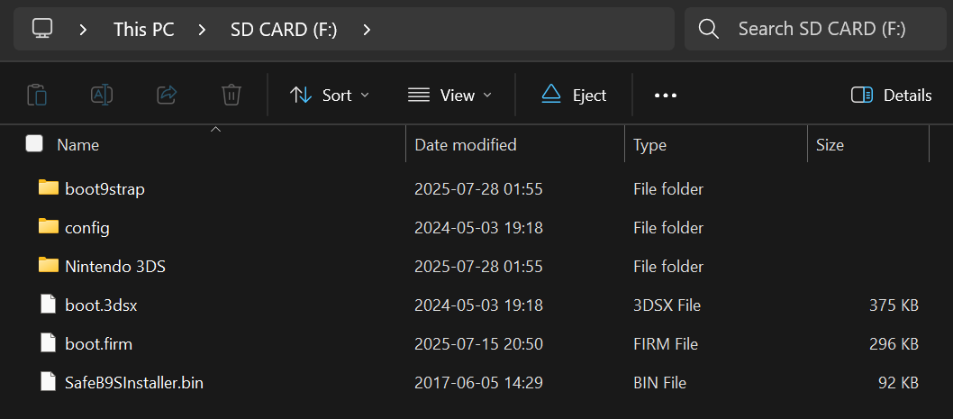 SafeB9SInstaller.binfrom the SafeB9SInstaller.zipto the root of your SD card - Reinsert your SD card into your console