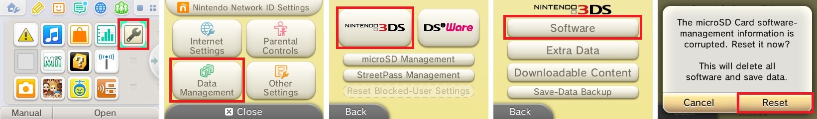 Data Management->Nintendo 3DS->Software-> Reset (image)- This will not wipe any of your data