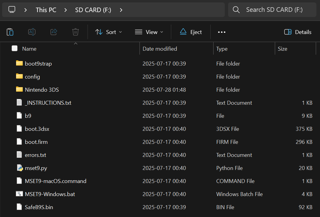 cdto the root of your SD card, then typepython3 mset9.pyand press Enter